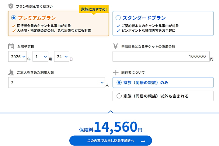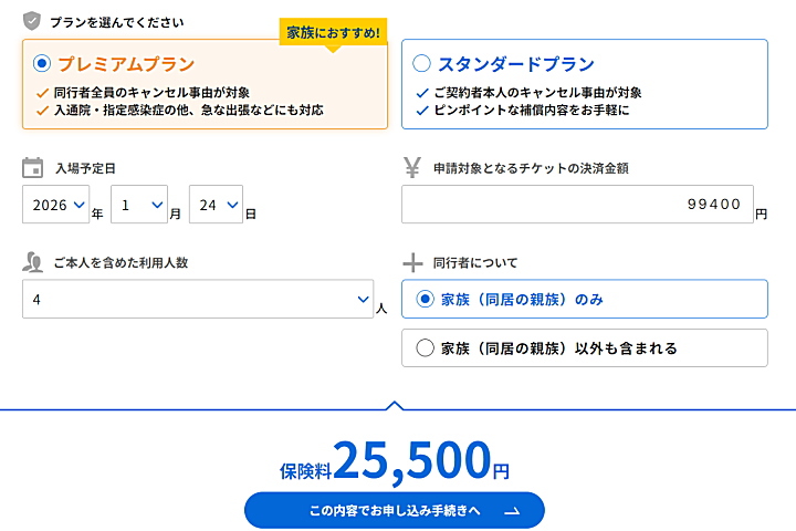 チケット代金は家族全額の補償ですが